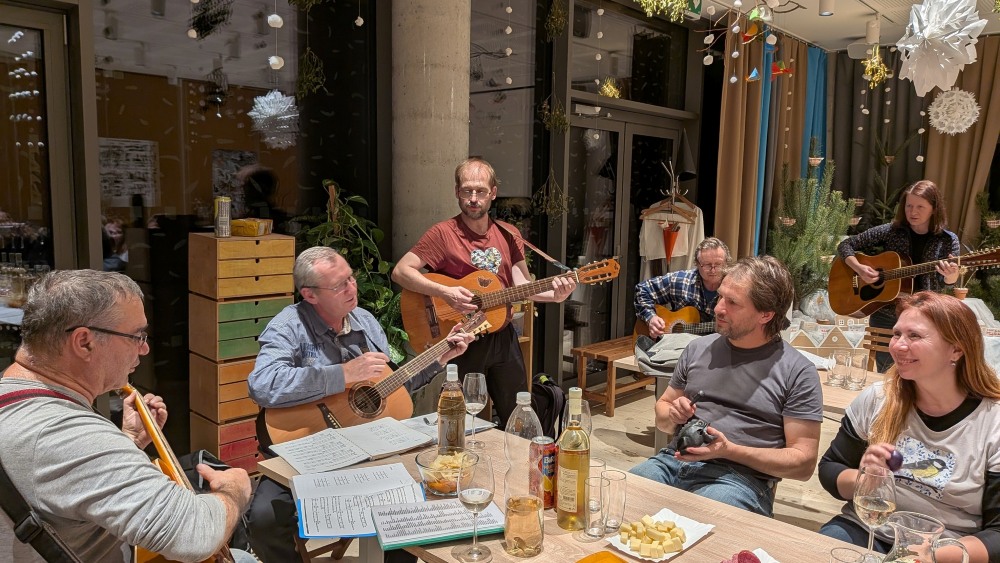 Večer pak pokračoval pro ty, kteří nespěchali domů, volnou zábavou u kytar a dalšího dobrého jídla a pití. U toho byl prostor něco si říct se starými známými, stejně jako se seznámit s dalšími na ptáky zaměřenými lidmi. Pauzy mezi písničkami amatérského hudebního sdružení, které vzniklo pro tuto chvíli a toto místo, vyplňoval Martin Vymazal veršovanými hádankami – samozřejmě opět o ptácích.